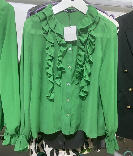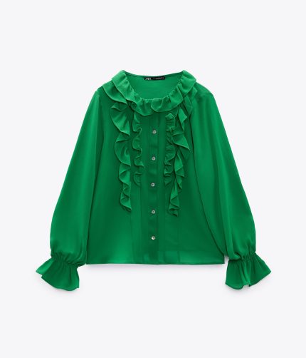 Blouse featuring a round neck and long sleeves with elastic trim. Ruffled trims. Button-up front.