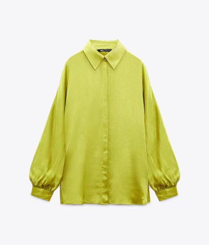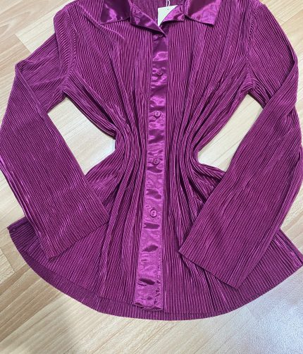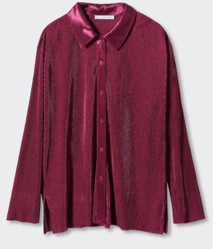Recycled polyester material. Pleated fabric. Flowy fabric. Long design. Straight design. Shirt-style collar. Long sleeve. Button fastening on the front section. Co-ord. Party and events collection.