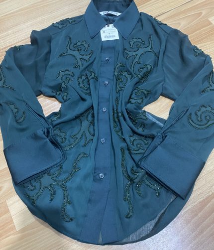 Semi-sheer collared blouse featuring long sleeves with cuffs. Matching bead appliqué embroidery details. Asymmetric split hem. Button-up front.