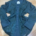 Semi-sheer collared blouse featuring long sleeves with cuffs. Matching bead appliqué embroidery details. Asymmetric split hem. Button-up front.